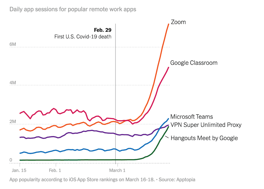 With use-cases ranging from product launches and corporate trainings, to virtual conferences and classroom environments, major players in the communication technology spaces are noticing the impact of the virtual revolution. Microsoft experienced a 70% increase in MS Teams daily active users from March to April 2020 to more than 70 million daily active users (The Verge). Likewise, according to Google CEO Sundar Pichai on the company’s earnings call on April 28, 2020, “we are now adding roughly 3 million new users each day and have seen a thirty-fold increase in usage since January. There are now over 100 million daily Meet meeting participants” (Alphabet Investor Relations); and according to Zoom’s First Quarter Results for Fiscal Year 2021, the platform’s first quarter total revenue was $328.2 million—up 169% year-over-year (Zoom).